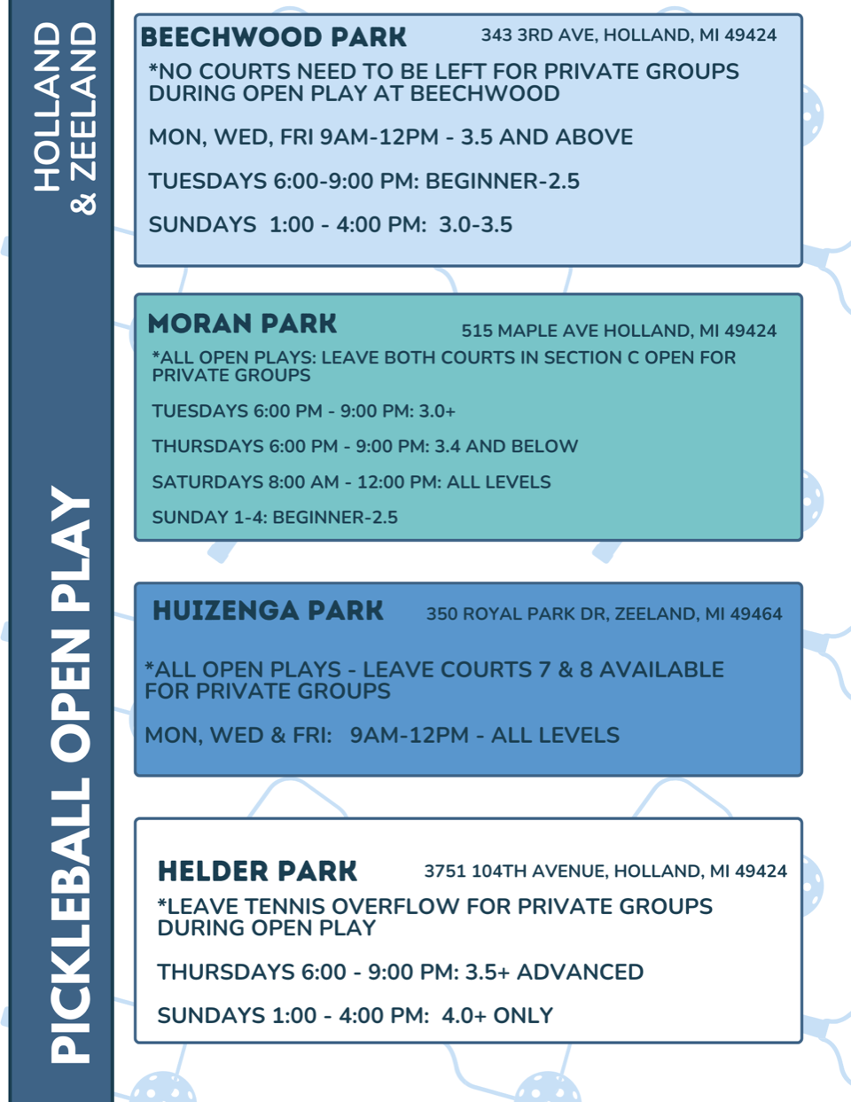- 2 courts will always be reserved for non-scheduled play (see protocols below)